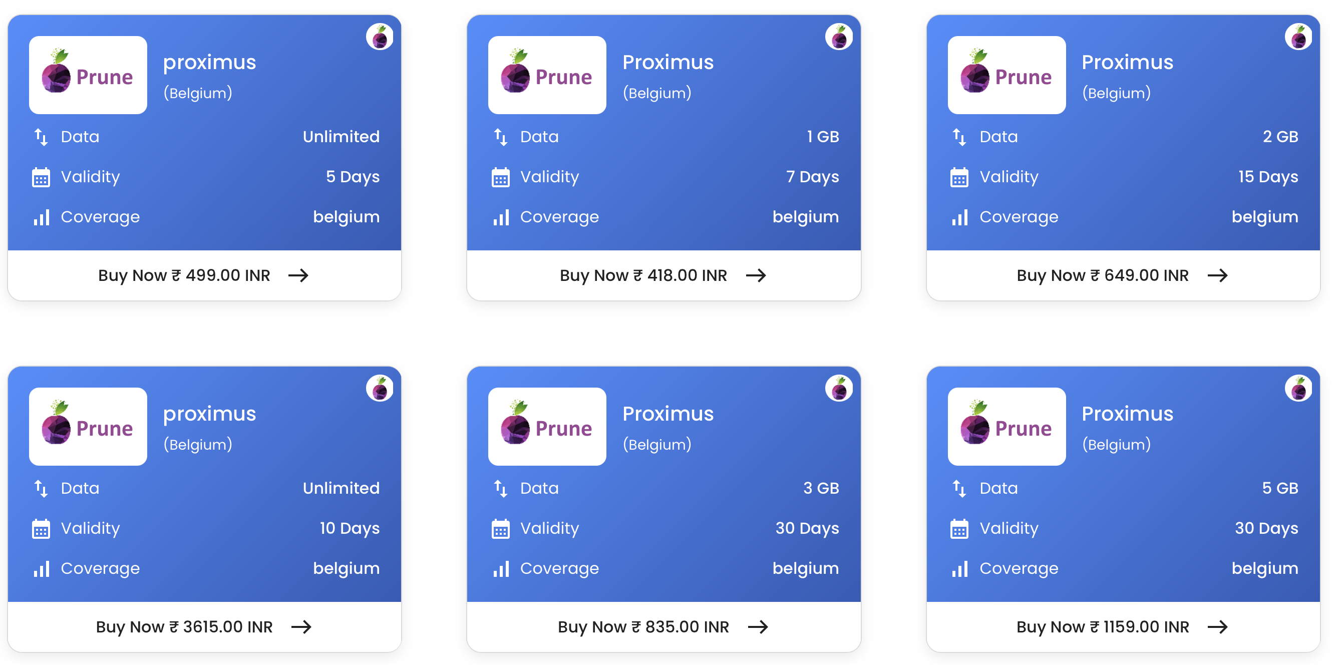 ● Browse Prune's data plans tailored to Belgium and select the plan that best suits your needs.